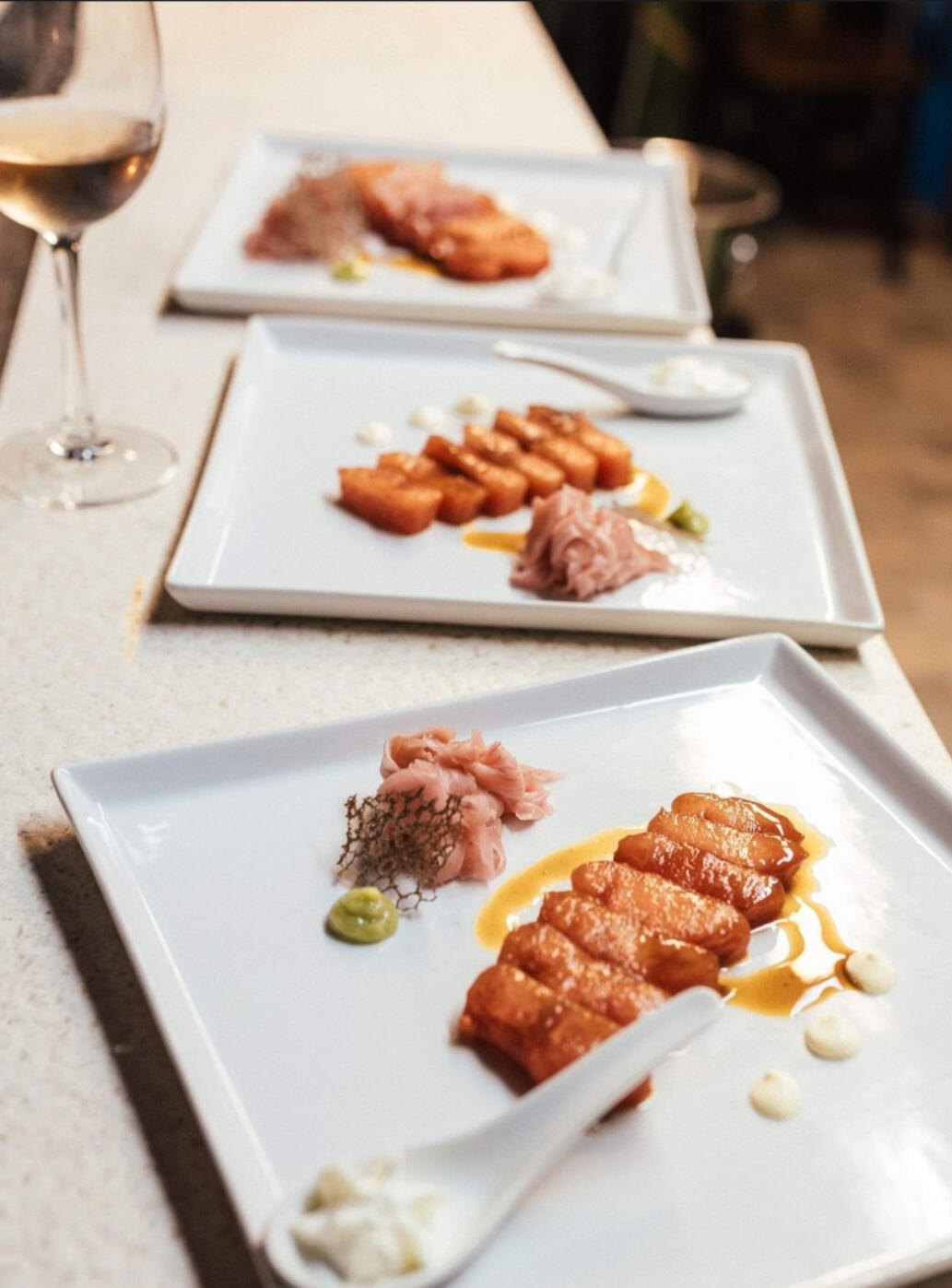Pan-fried Tuna, marinated Tuna, avocado cream, salsa, spring onion oil, seaweed